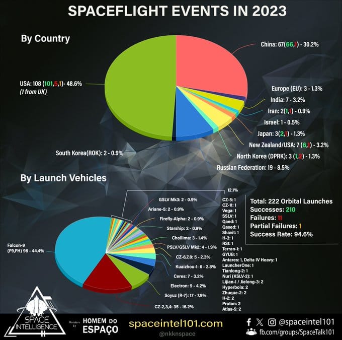 Across the board, 2023 was a record breaking year, 222 orbital launches were attempted, with 210 successes, 11 failures and one partial failure, giving a success rate of 94.6%.