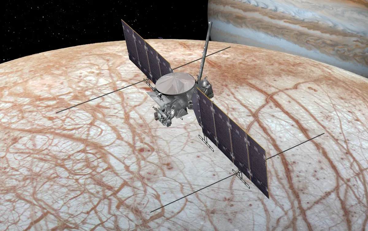 In May 2018, astronomers found new evidence supporting the presence of water plumes on Europa, based on a reanalysis of data from the Galileo space probe, which orbited Jupiter between 1995 and 2003. These plumes could provide a way to study Europa’s subsurface ocean without the need to land on the moon, offering a promising opportunity for the search for life. However, in March 2024, new research suggested that Europa's surface may contain less oxygen than previously thought. The majority of what we know about Europa comes from NASA’s Galileo mission, launched in 1989. While no spacecraft has landed on the moon yet, multiple missions have been proposed to explore Europa further. The European Space Agency's Jupiter Icy Moon Explorer (JUICE), launched in April 2023, is currently en route to study Jupiter’s moon Ganymede, with plans to make two flybys of Europa along the way.