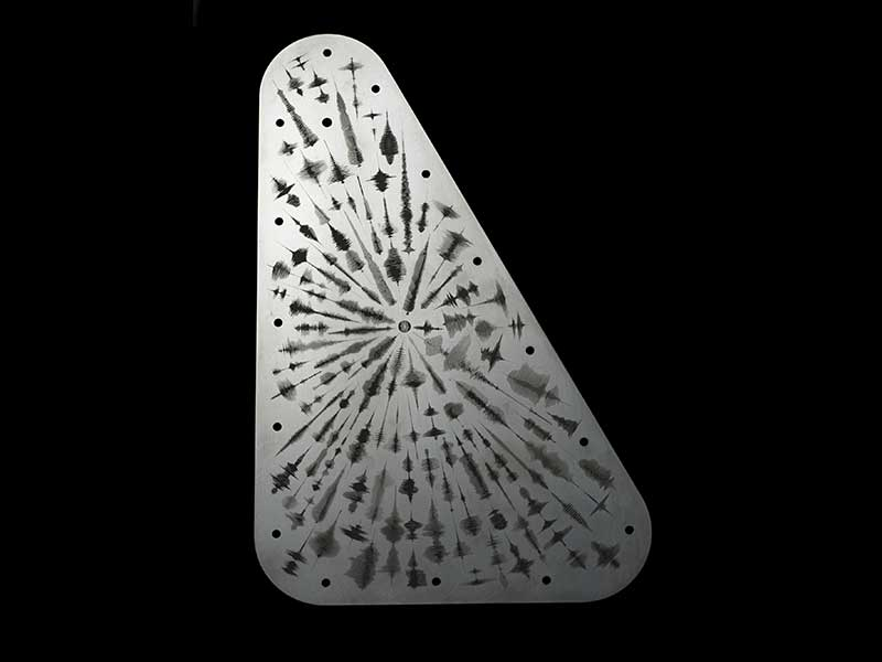 The theme for Europa's vault plate, which will go with the Europa Clipper to the icy moon can be summed up in one word--Water. water connects our planet to Earth. The Europa Clipper mission aims to confirm that a vast ocean exists beneath Europa's surface. This shared element of water has influenced every aspect of the vault plates design. The plate, made of tantalum metal 1mm thick and about 7 by 11 inches is part of the structure that will protect Europa Clipper's electronics. The outward-facing side features a piece called "Water Words" which is a visual representation of the word for water in 103 spoken languages, extending from a central symbol that represents the sign for water in ASL. Audio recordings of these words are engraved on the vault plate as waveforms.