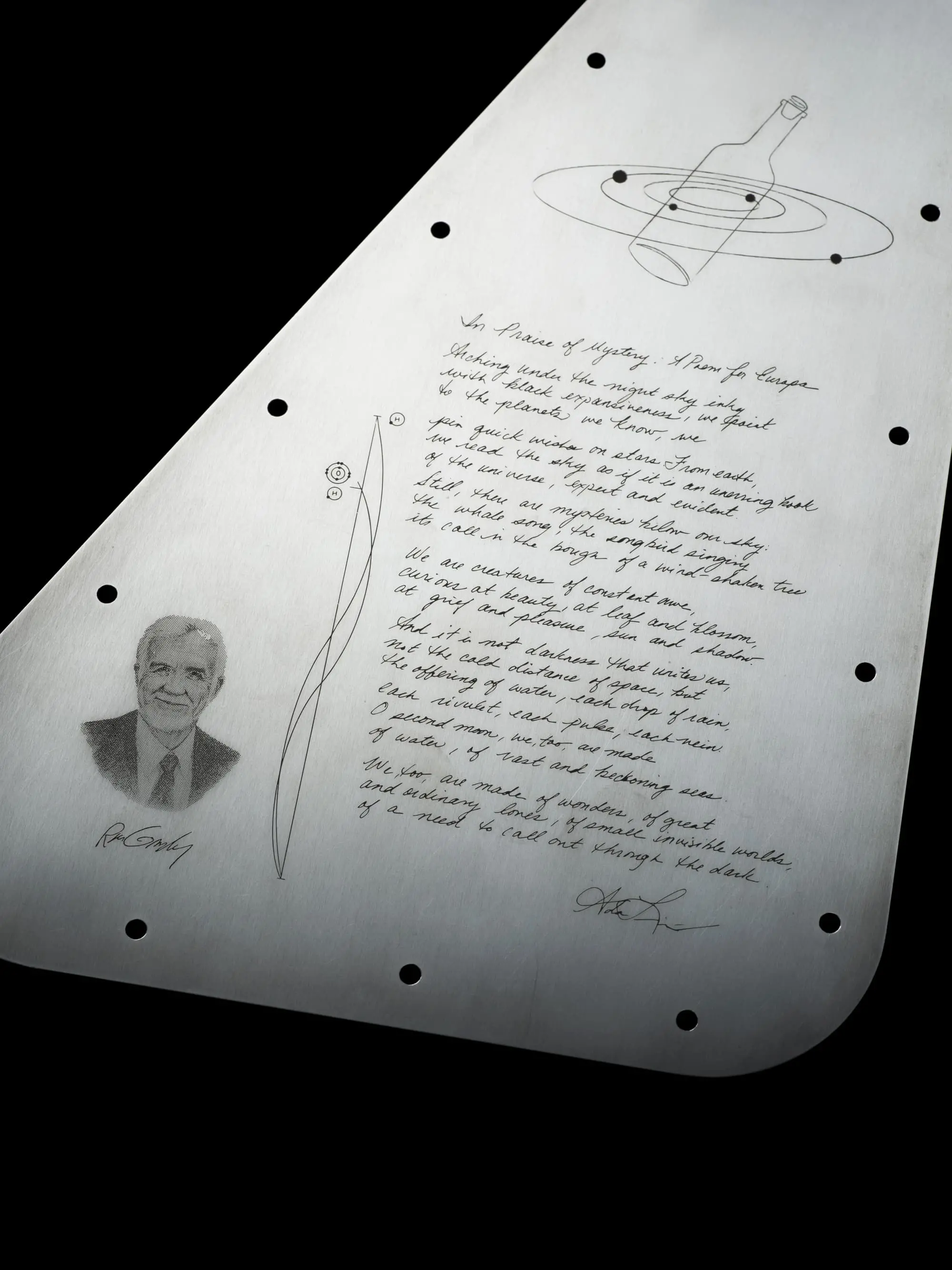 This original poem, penned by U.S. Poet Laureate Ada Limón in her own handwriting, is engraved on the vault plate. It intertwines the two water worlds: Earth, which yearns to grasp what makes a world habitable, and Europa, poised with secrets yet to be uncovered.