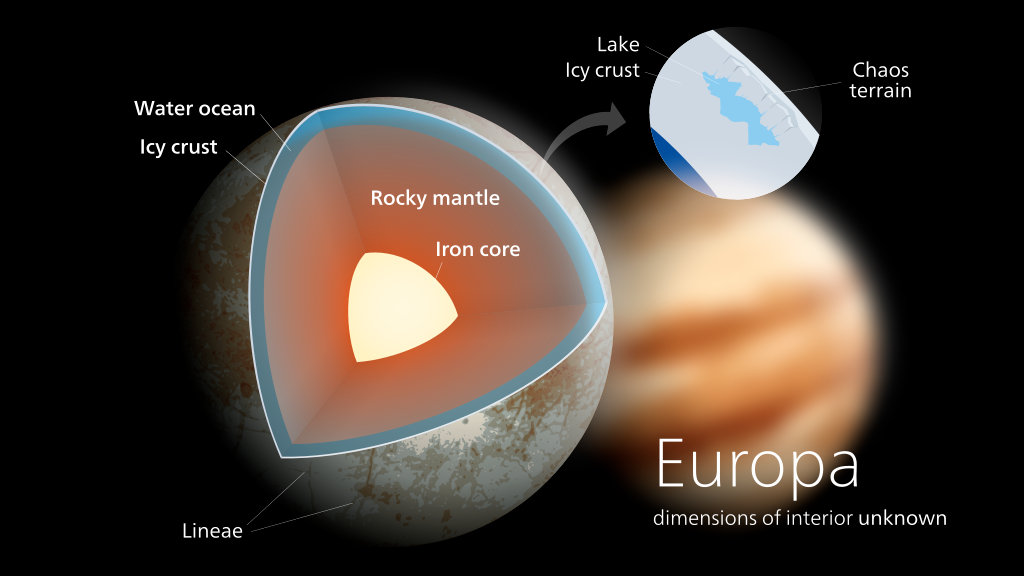 Slightly smaller than Earth's Moon, Europa is primarily made of silicate rock, covered by a water-ice crust, and likely possesses an iron-nickel core. Its atmosphere is extremely thin and made mostly of oxygen. Europa’s surface, geologically young and striking in its smoothness, is crisscrossed by tan-colored cracks and streaks, with few visible impact craters. Both Earth-based telescopes and a series of spacecraft flybys, starting in the 1970s, have offered glimpses of Europa. In September 2022, NASA’s Juno spacecraft passed within 320 kilometers (200 miles) of the moon, providing a close-up look at its icy terrain.