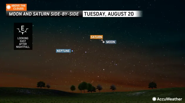 Just a day after taking all the limelight, the Moon once again is the star of the show as it and Saturn are going to be side by side all night. After the sun sets on Tuesday, Saturn, one of the easiest to spot planets in the night sky will rise just above our celestial neighbor. This will be an amazing thing to see, especially if you own binoculars or a telescope. Neptune will also make an appearance during this event down to the left of the Moon and Saturn. However, you unfortunately won't be able to see the far-out ice giant with the naked eye.