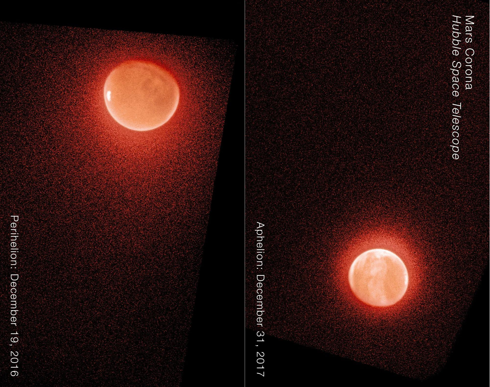 NASA's Hubble Space Telescope and the Mars Atmosphere and Volatile Evolution (MAVEN) spacecraft teamed up to solve one of the big mysteries surrounding Mars. Looking at Mars now, you see this dry, desert world. It would be hard to believe that some billions of years ago, the red planet harbored oceans spanning hundreds of kilometers. There were some theories about how Mars lost its oceans, but nothing has been proven. That was until these images from Hubble allowed scientists to see hydrogen atoms escaping Mars into space. (Image rotated to fit the site better, source image here)