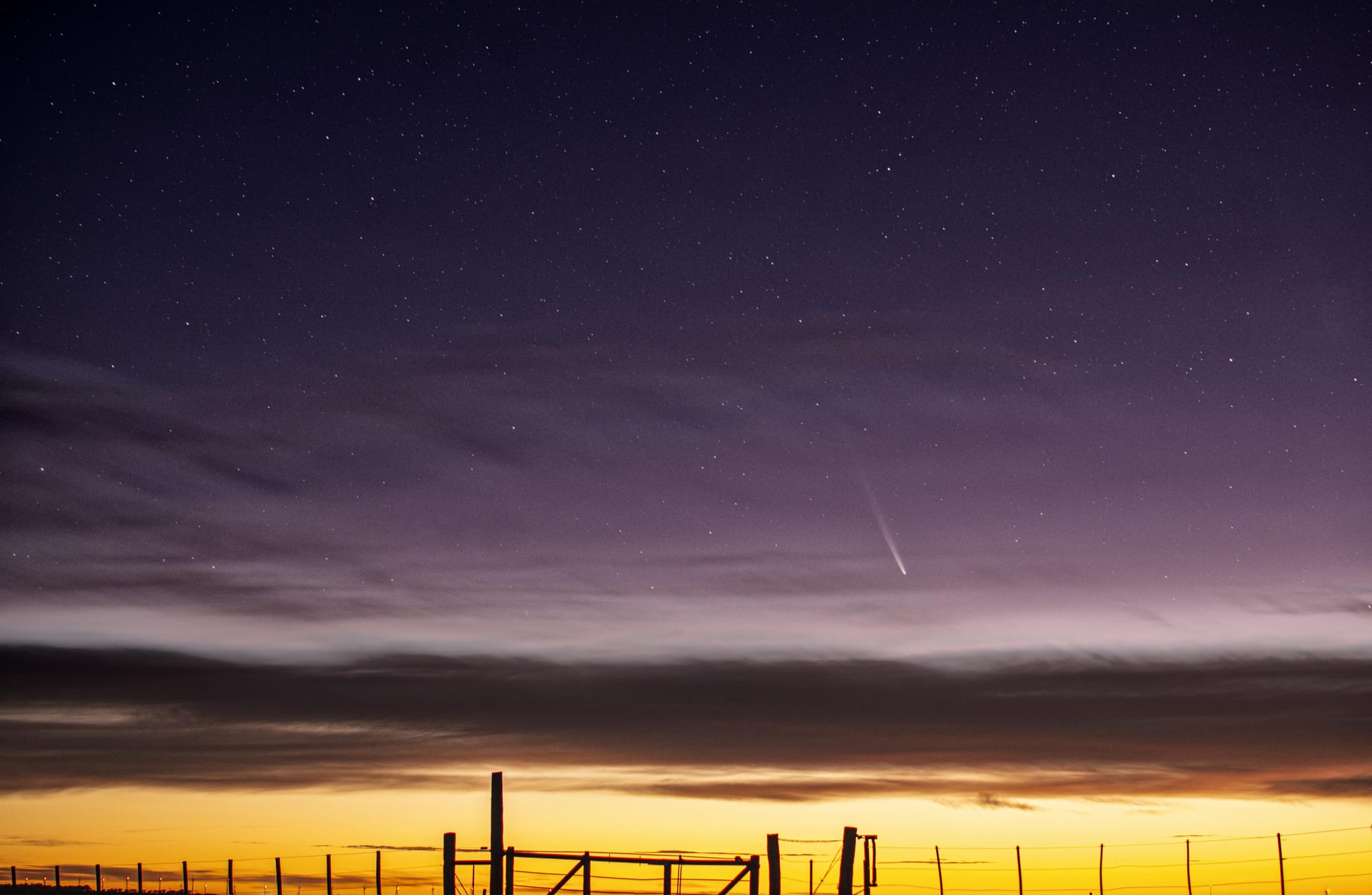 To try and capture a glimpse of the Comet, look low and to the west/southwest after sunset. As time passes, the Comet will rise into the night sky but slowly dim. It is visible to the unaided eye, but using a telescope or binoculars will give you the best view!