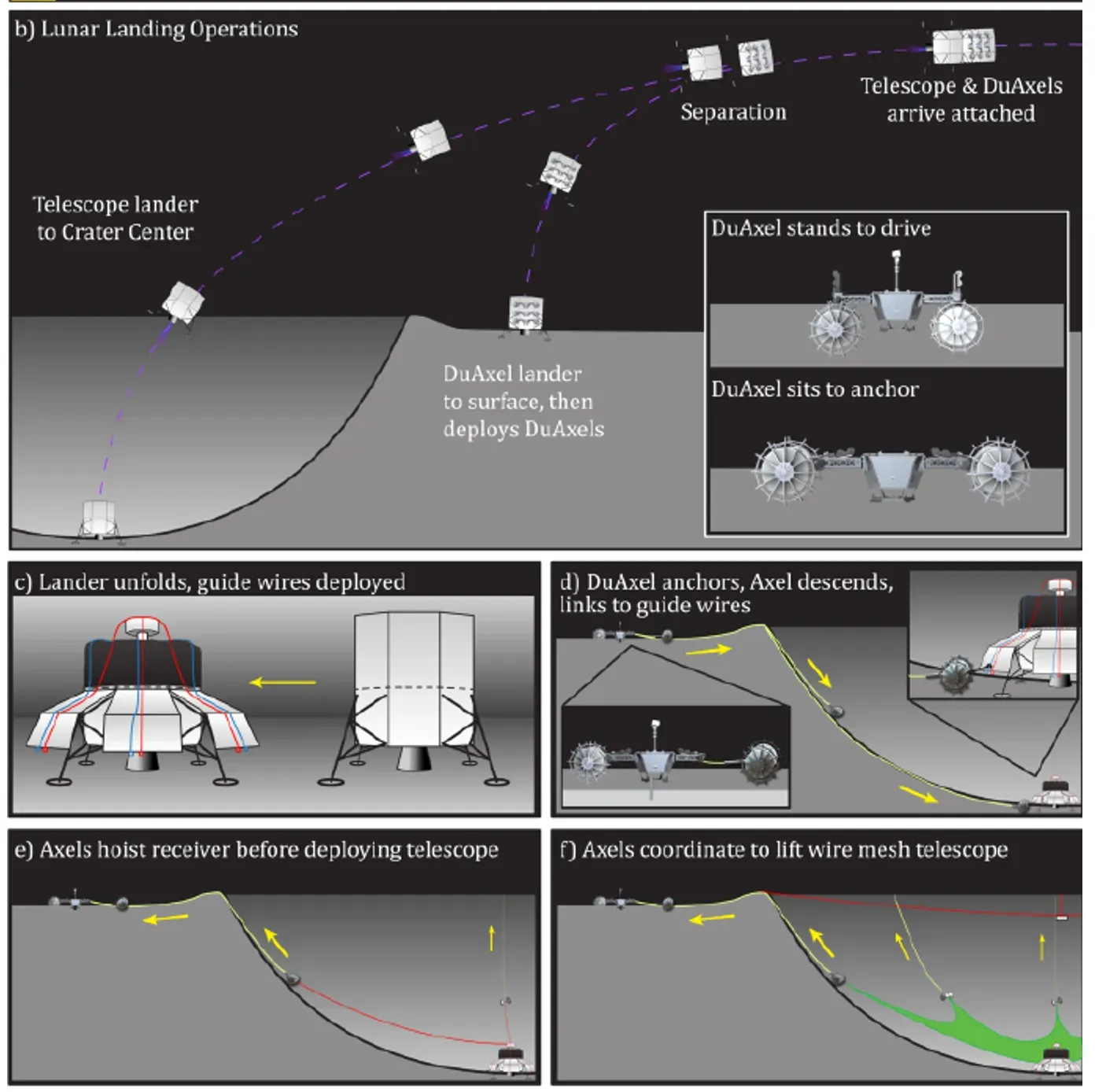 The Telescope lander then unfolds and deploys its guide wires. While this is occurring, the DuAxel anchors descend links to meet up and attach to the guide wires. Once the Axels link up with the guide wire, they would hoist the receiver before they lift the wire mesh telescope.